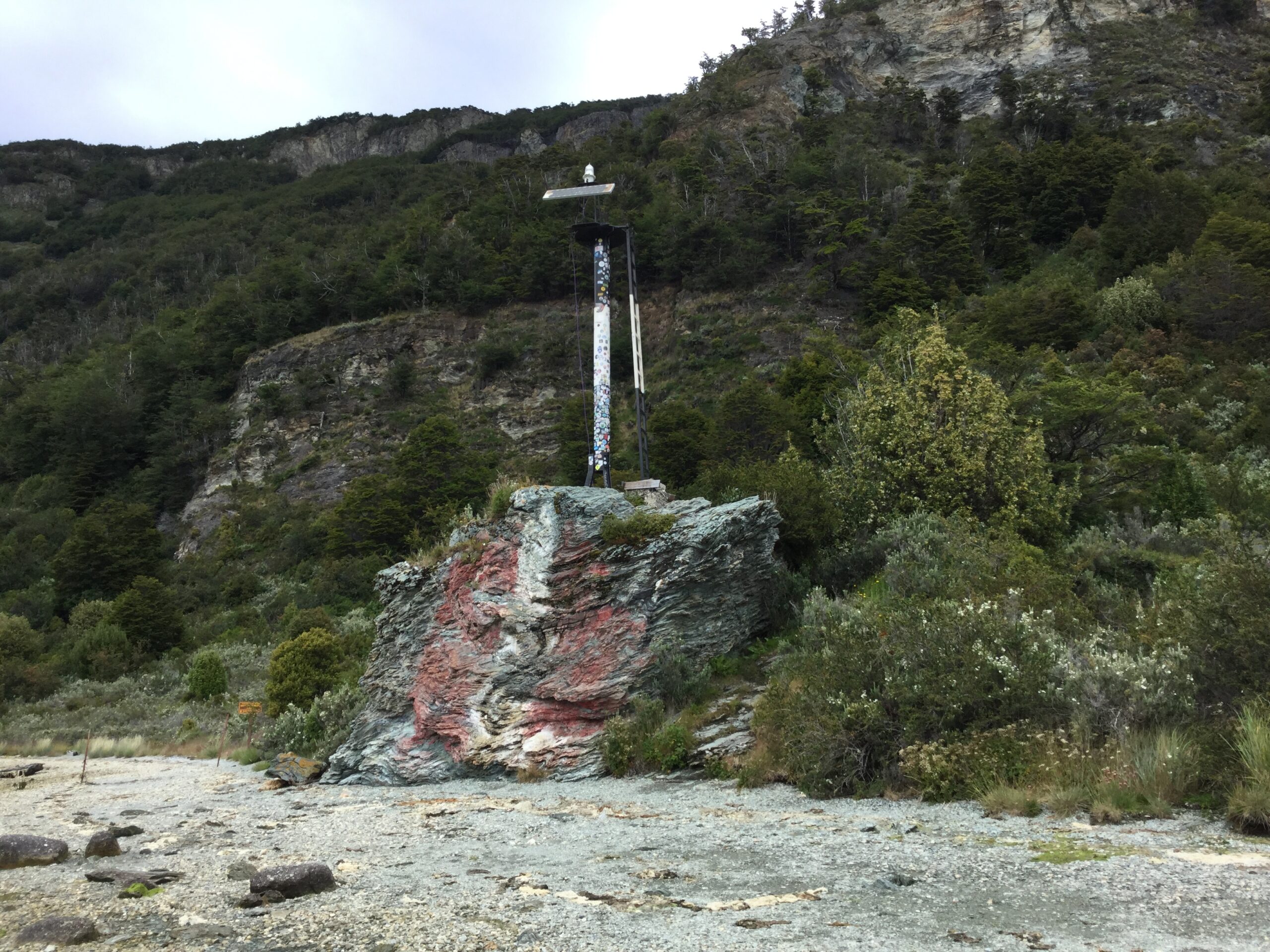 Baliza ubicada en el Parque Nacional Tierra del Fuego en un lugar con intenso uso turístico cercano al lugar donde termina la Ruta Nacional N° 3.